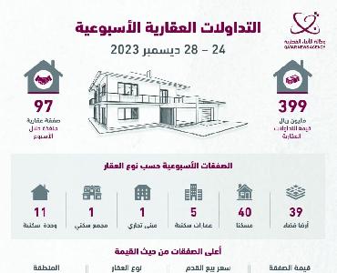 بلغ حجم تداول العقارات في عقود البيع المسجلة لدى إدارة التسجيل العقاري بوزارة العدل خلال الفترة من 24 إلى 28 ديسمبر الماضي، 372 مليونا و337 ألفا و001…